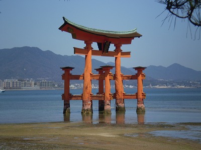 厳島神社は、広島県廿日市市の厳島(宮島)にあり、1400年の歴史をもつ日本全国に約500社ある厳島神社の総本社である。社殿のある三笠浜(みかさのはま)を囲むように突出した東の宮崎と西の西崎との間に、本社火焼前(ひたさき)より八十八間の沖合に高さ16㍍の朱の大鳥居が建つ。この色は光明丹(こうみょうたん)という顔料の一種の酸化鉛で、鉛ガラスの原料や陶磁器の釉などのほか多く錆止めなどに使われる。屋根は桧皮葺(ひわだぶき)、光明丹で錆(さび)どめを施されたこの両部鳥居は、本体の鳥居の柱を支える形で稚児柱(稚児鳥居)があり、その笠木の上に屋根がある鳥居。