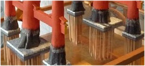 市市役所ホールに宮島工業高校製作の大鳥居の模型が展示されていた。脚柱部の地中に数百本の木杭が打ち込まれていると子供時分に聞いた記憶のイメージ通り、その様子が模型で再現されていた。大鳥居は地中に木杭で基礎を固めているが、基礎の上に乗っかっているだけで、笠木の下の島木を箱型にし、中に小石を数トン入れて、鳥居の自重で倒壊しない工夫がされている。